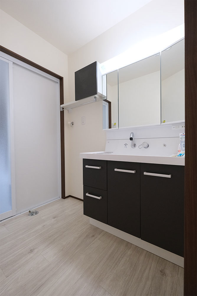 LDKは日当たりの良い南面に配置し、キッチンからは水回りや大きな物入(タンスや衣類、食材、季節もの用品)の動線を確保し、寝室には収納を多くして、寝室からトイレや水回りの動線を確保しました。