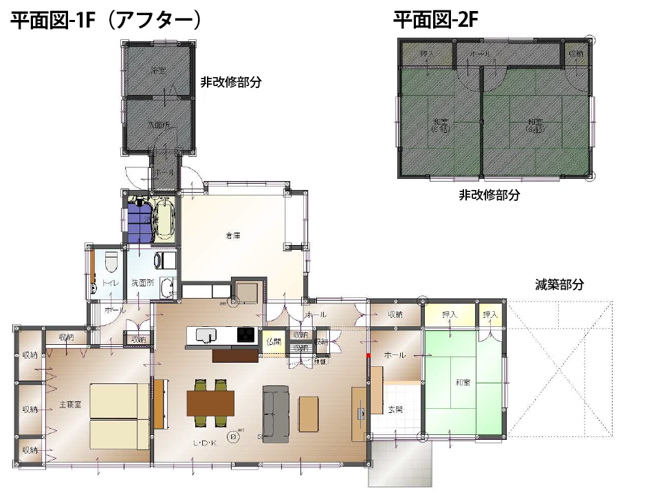 使わない部屋は減築し、建築費を抑えるため2階や動線から遠いお風呂や洗面はリフォーム対象から除外し、温かで動線の良いプランに変更、延べ床面積106.27㎡ (32.2坪)の面積をリノベーション。