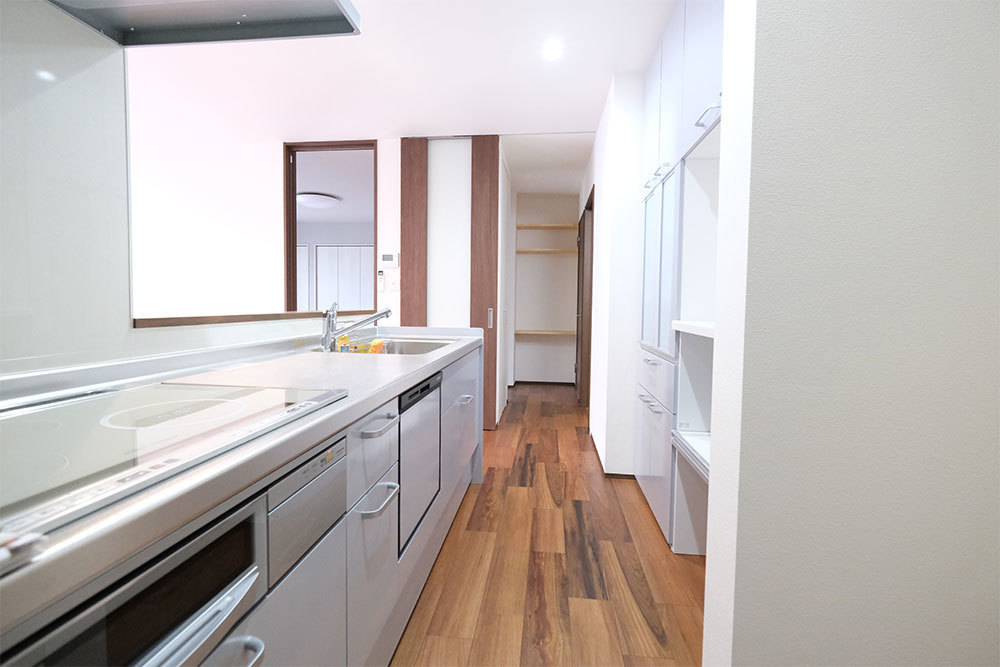 LDKは日当たりの良い南面に配置し、キッチンからは水回りや大きな物入(タンスや衣類、食材、季節もの用品)の動線を確保し、寝室には収納を多くして、寝室からトイレや水回りの動線を確保しました。