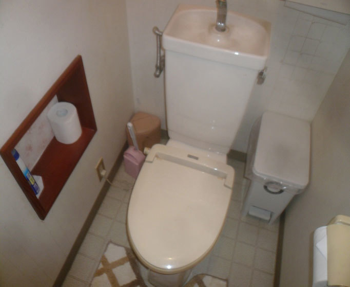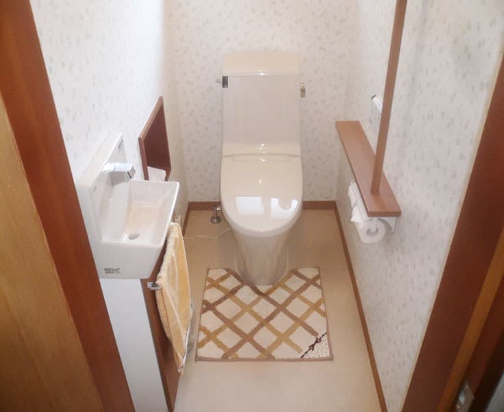 古いトイレを新しくしたいとのことで、ご高齢の方が住んでいることもあり、入口部分の段差を解消するとともに、内部に手洗い・手摺を取り付け、トイレをリニューアルしました。